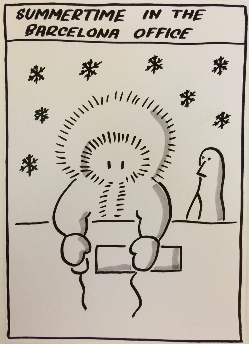 Given the external heat & humidity of a Barcelona summer you might expect the climate inside the office to be somewhat and insufferably similar. On the contrary: the instant summer arrives the office turns into an air-conditioned ice box.