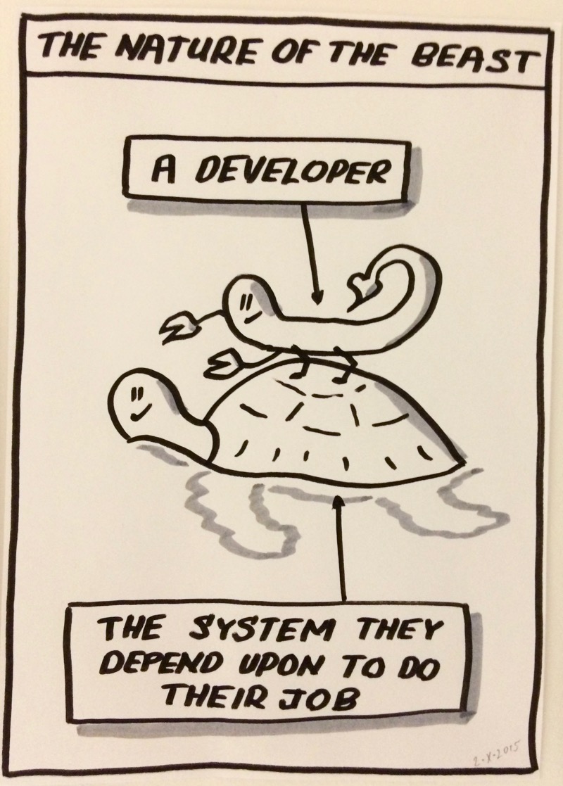 This relates to the fable about the scorpion who pleads with the turtle to carry him across the river and assuages the turtle’s doubts about the scorpion stinging him by explaining that death to the turtle would also mean to death to the scorpion—weak swimmer that he was—so then why would he sting him. Of course the scorpion stings the turtle halfway across anyway, because that’s what he does. Much like a developer will always jeopardise the stability of the system they use for their day-to-day work by installing, say, a beta release of iOS or Xcode or macOS, which Patryk did on a regular basis.